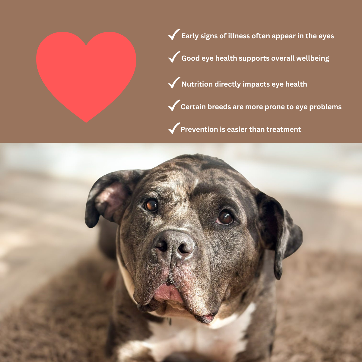 Good eye health helps dogs stay active, confident, and safe. Many conditions start subtly — a little redness, cloudiness, or excess tearing — but can progress quickly. Supporting your dog’s eyes through good nutrition is a simple, natural way to help prevent problems.
