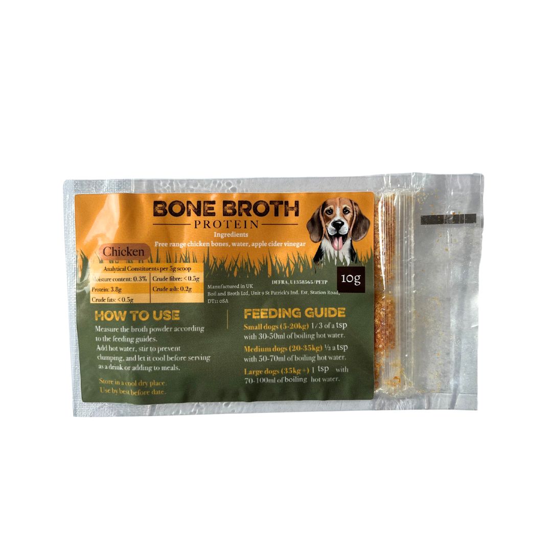 Try our dehydrated chicken broth for dogs in our handy 10g sample. This sample rehydrates back to 200ml of liquid broth.