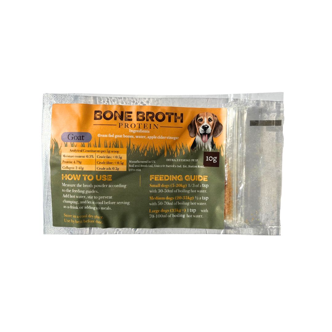Try our dehydrated goat broth for dogs in our handy 10g sample. This sample rehydrates back to 200ml of liquid broth.