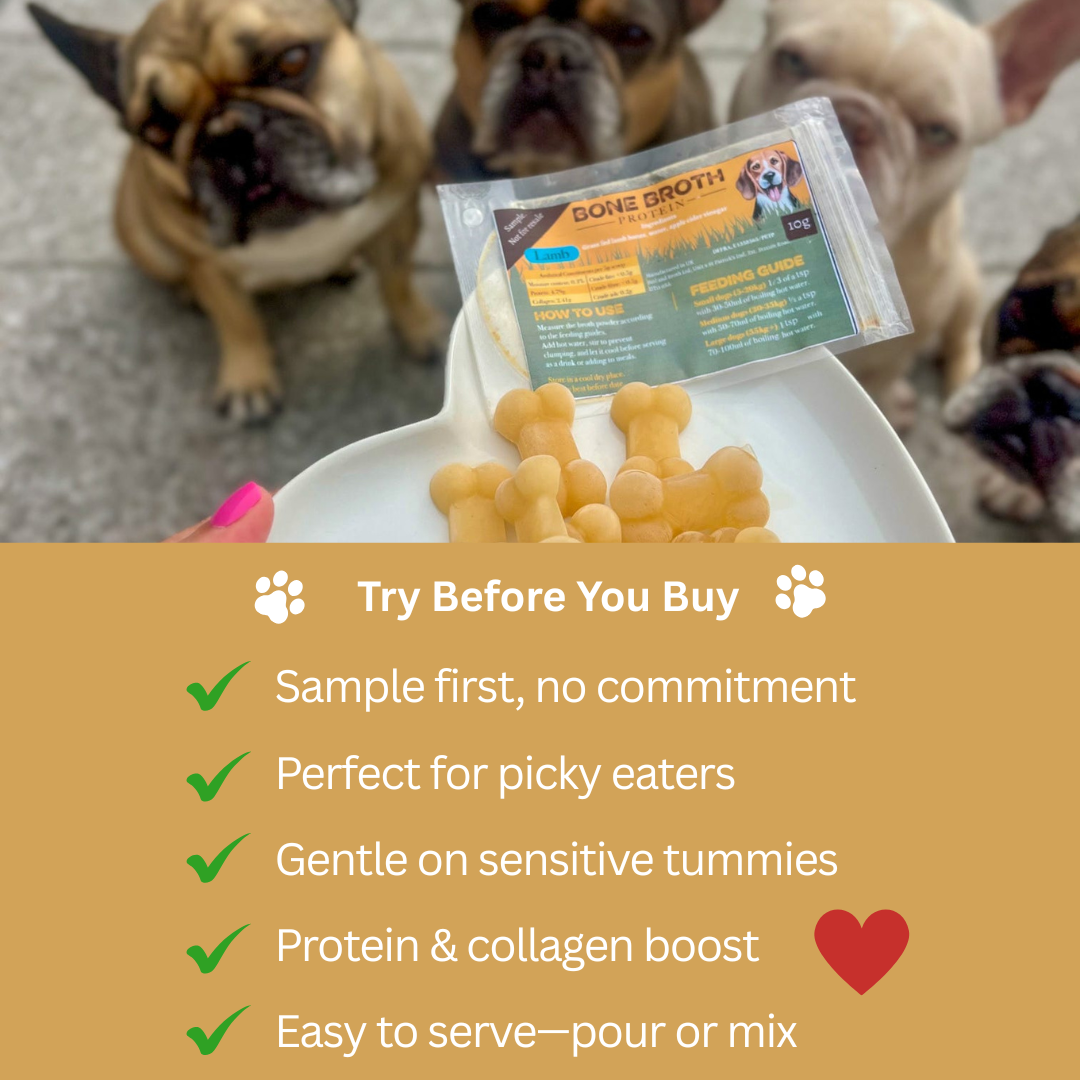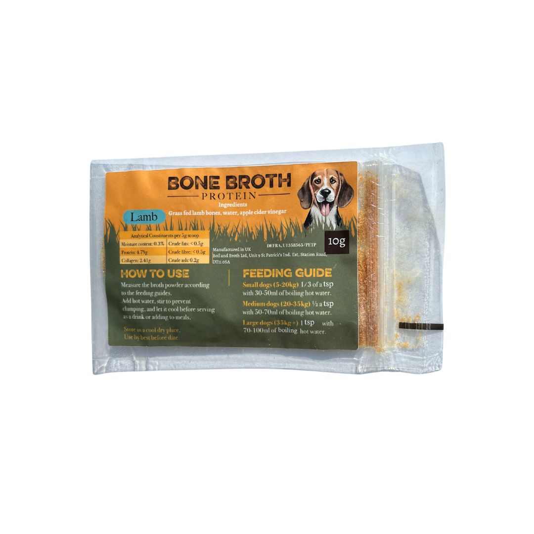 Try our dehydrated LAMB broth for dogs in our handy 10g sample. This sample rehydrates back to 200ml of liquid broth.