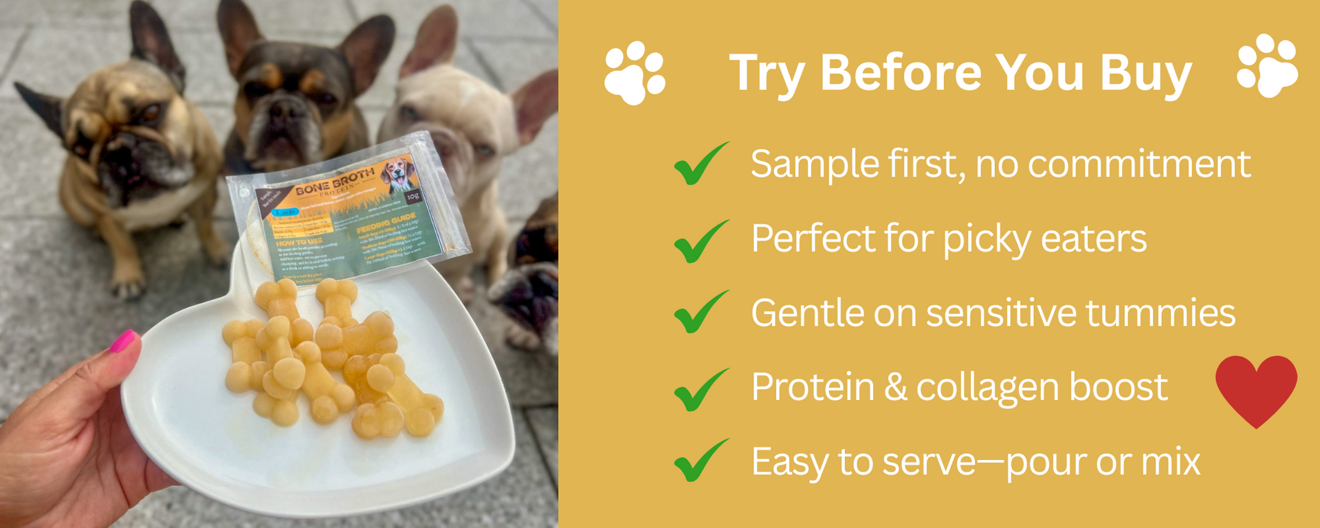 Let your pup taste the goodness first. Our natural dehydrated bone broth adds a tasty boost to any meal, great for fussy eaters and gentle on tummies.