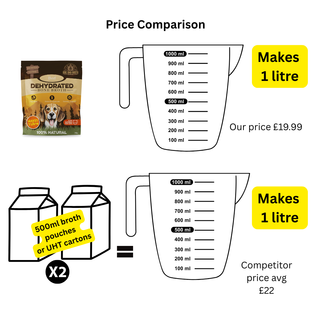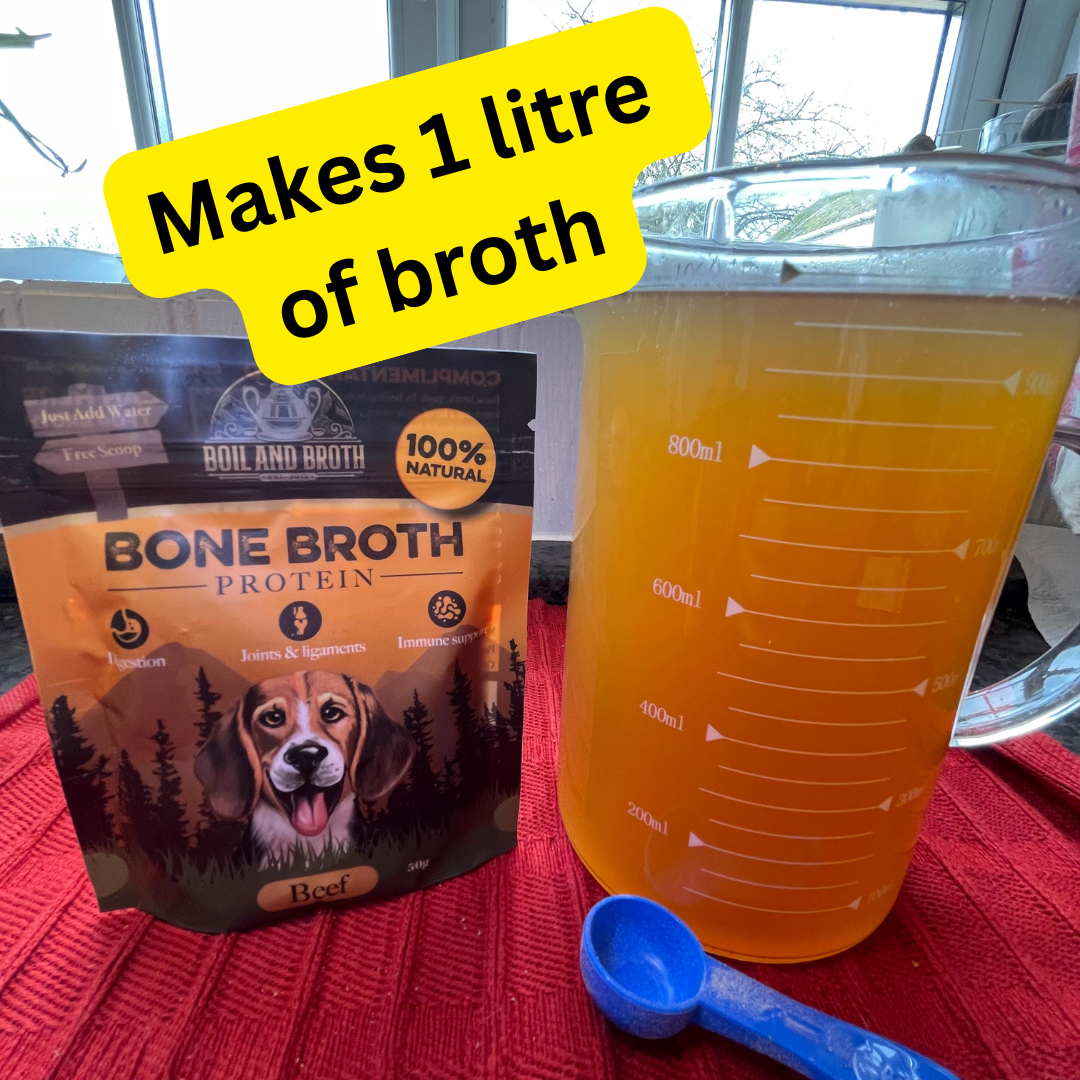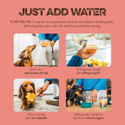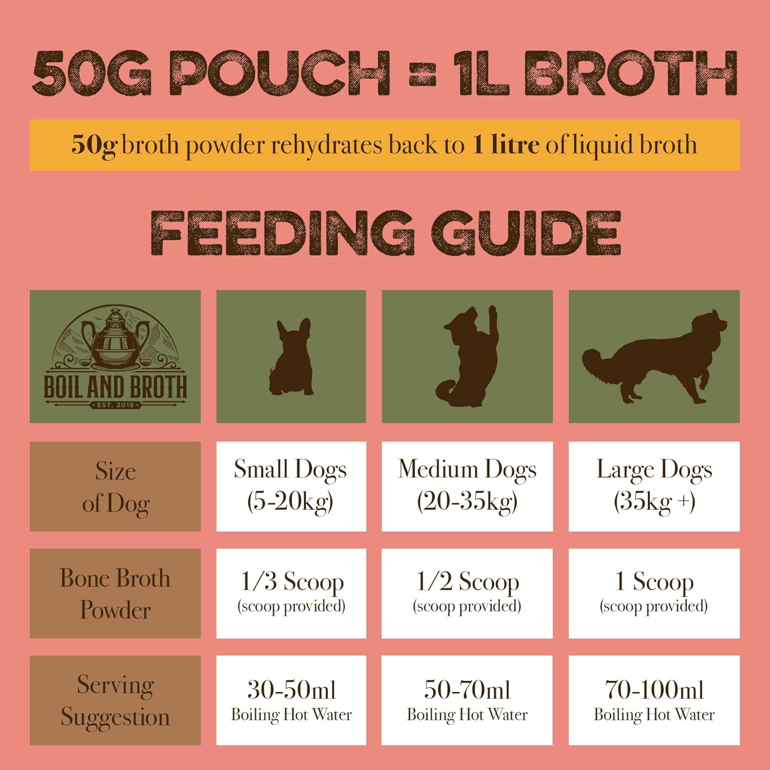 Our dehydrated broths are easy to use. Using the scoop provided measure the following amounts for your dog weight and then add with boiling hot water.