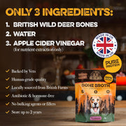 British wild deer venison bones, water, apple cider vinegar (processing ingredient only) – dehydrated.
