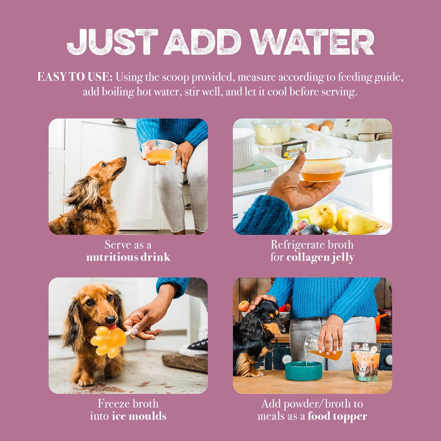 Give your dog the broth either as a drink or pour onto meals. Great as a topper.