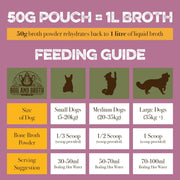 Our dehydrated broths are easy to use. Using the scoop provided measure the following amounts for your dog weight and then add with boiling hot water.
