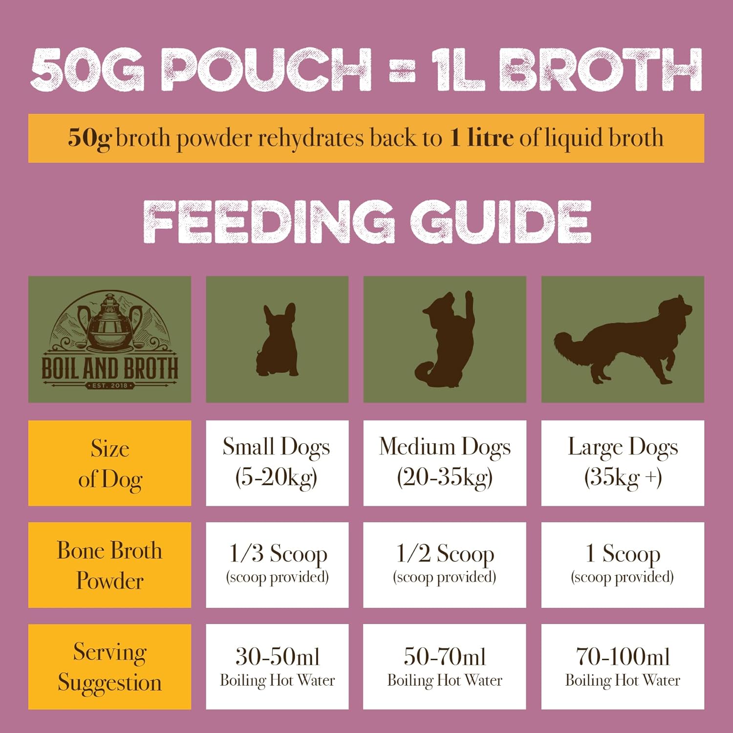 Large Dog (35kg+) = 1 scoop with 100ml of boiling hot water.