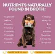 Caution must be taken when introducing any new supplements to your dog’s diet if they have CKD. Always consult with your vet. We do recommend small amounts of broth for dogs with CKD. Broth is great for gut health, so giving your dog 10ml of rehydrated broth daily can help support their gut health and keep them hydrated.